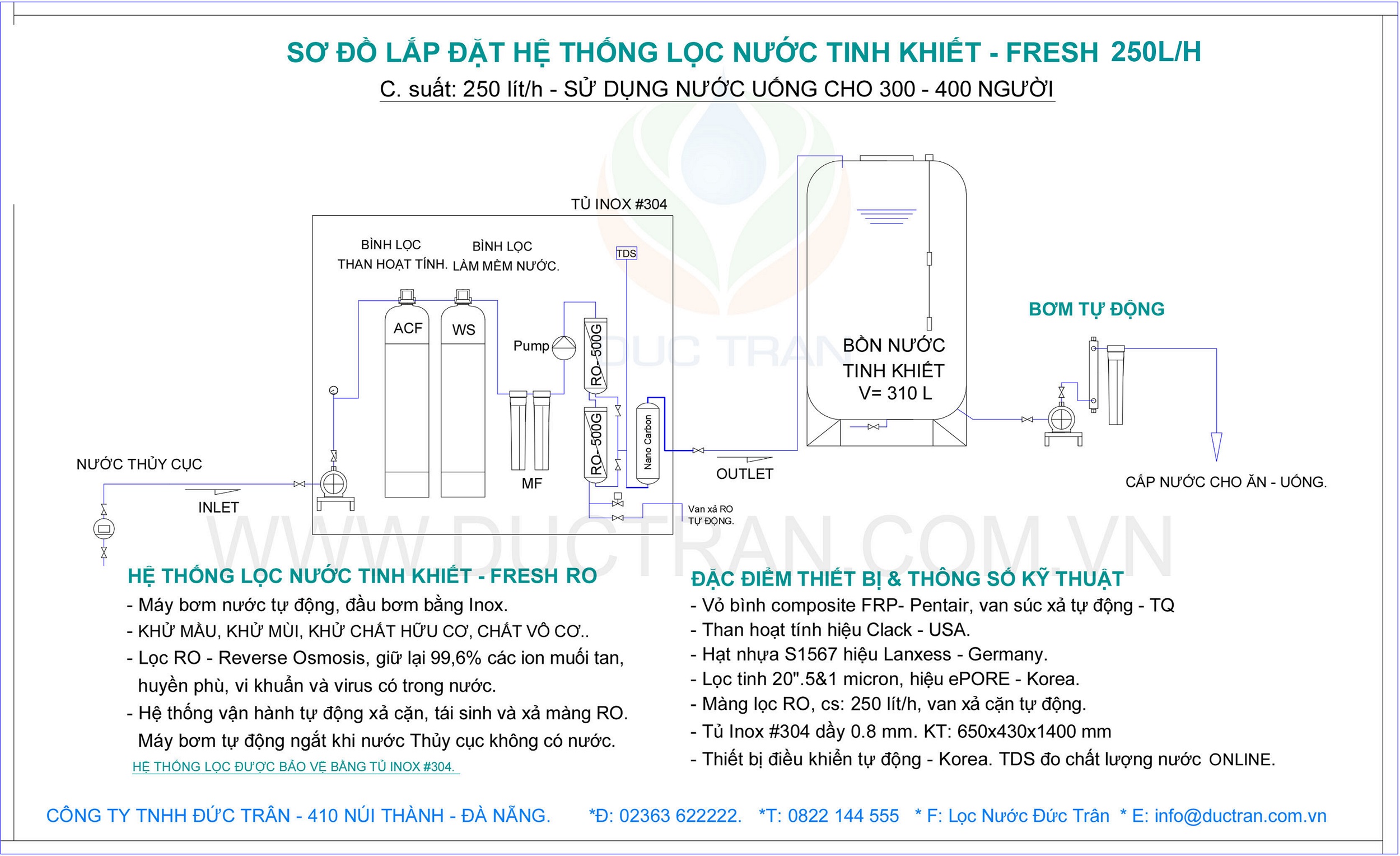 Hệ thống lọc nước RO công suất 250l/h là hệ thống phù hợp cho các đơn vị trường học, bệnh viện, khách sạn, đơn vị doanh nghiệp có số lượng nhân viên lớn hoặc các cơ sở sản xuất nước uống đóng chai với nhu cầu sử dụng nước uống tinh khiết. Cho ra nguồn nước sau lọc uống liền trực tiếp mà không cần đun sôi.